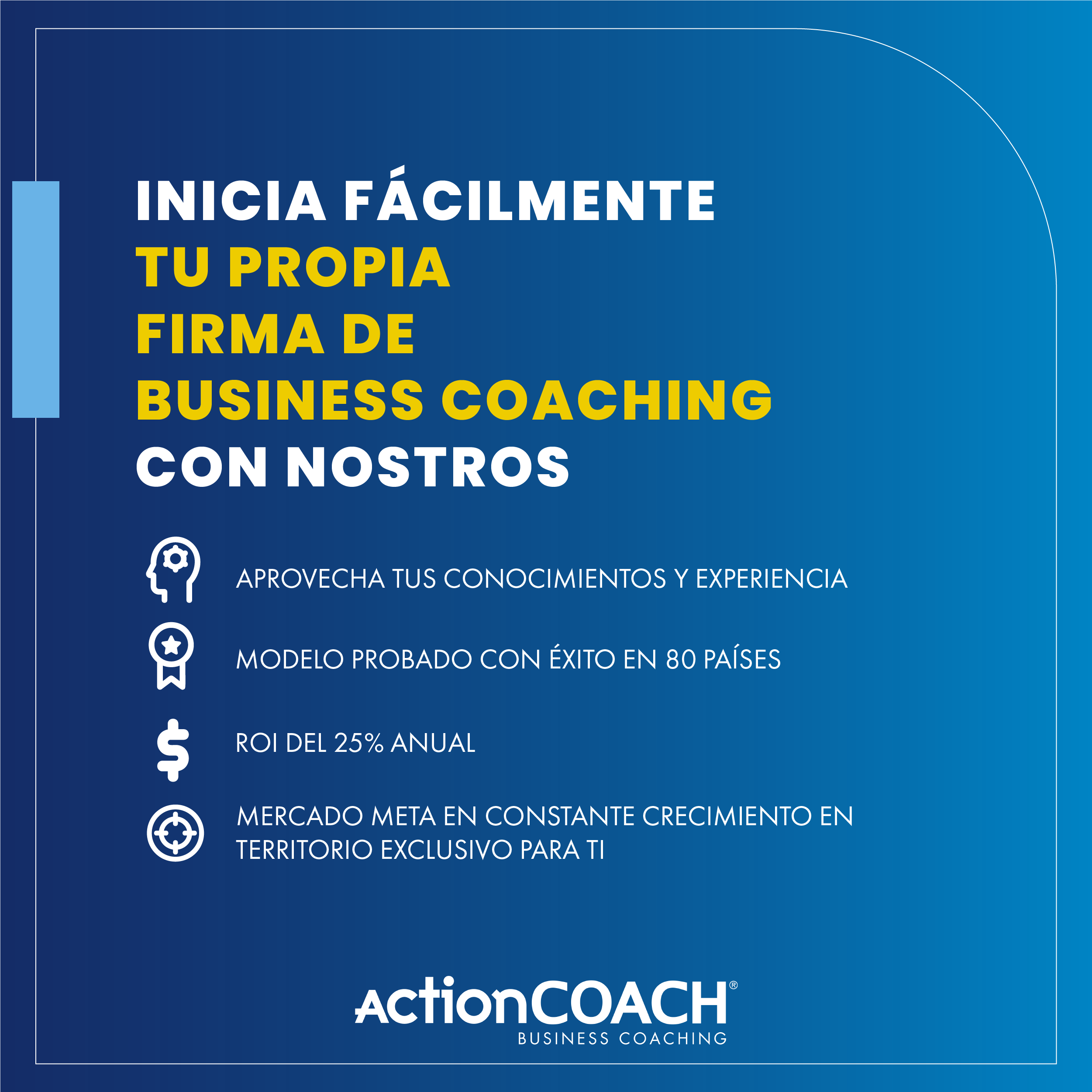 ActionCOACH es el negocio que estás buscando si además de obtener rentabilidad, deseas construir un equipo que opere tu franquicia y que te permita impactar positivamente a tu comunidad enfocándose específicamente en mejorar las PYMES de tu región ayudando a los dueños de las mismas a entender y jugar mejor su rol de dueño, sacándolos de la operación y de la trampa del autoempleo.