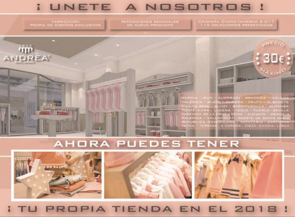 La franquicia de venta textil Andrea Milano 1932 esta segmentado básicamente en la MODA INFANTIL, aunque disponemos también de 3 líneas principales más de negocio dentro de la misma Franquicia, como el CALZADO, LOS COMPLEMENTOS y el REGALO, y otras secundarias como Bisutería, Perfumes, Accesorios Pelo.