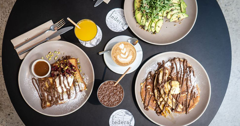 En Federal podrás experimentar el estilo de vida australiano, un servicio "non-stop", comida sana y sabrosa, con amplitud de platos saludables, una carta de café de especialidad servidos con leche fresca de soja con diente de león y una seleccionada oferta de cócteles y vinos que varían entre lo original e informal.