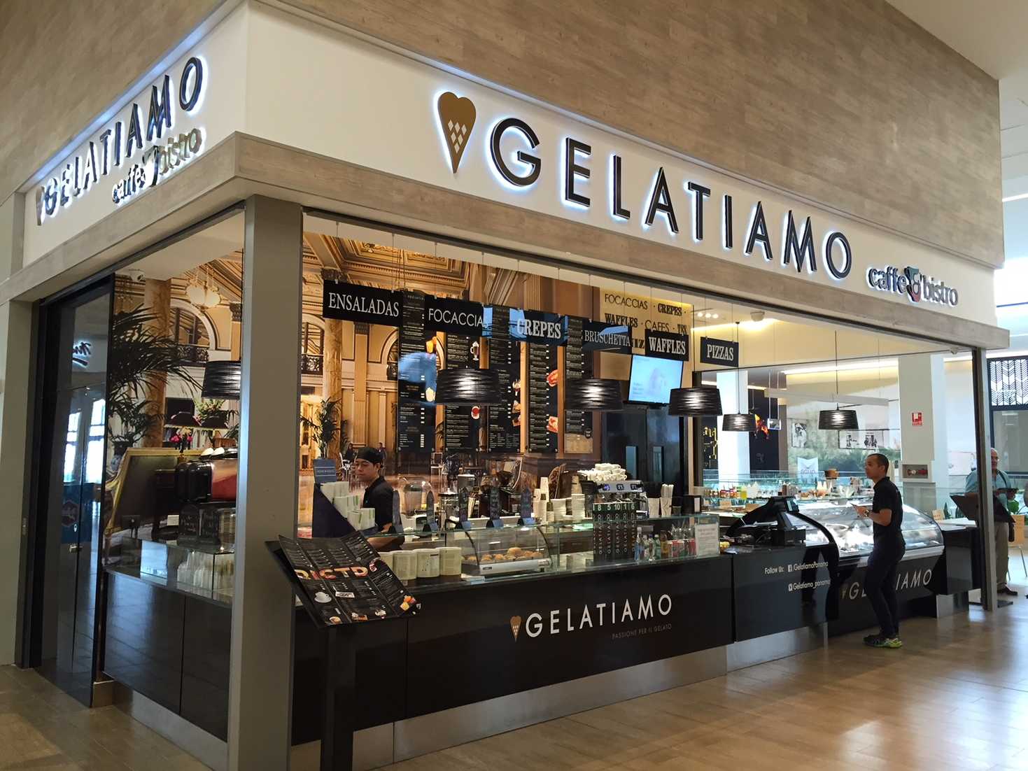 Gelatiamo ofrece a los emprendedores varias modalidades de inversión, siempre para zonas con alto tráfico de transeúntes. Así, los franquiciados pueden elegir, por orden creciente del tamaño de local, por una Isla en Centro Comercial; una heladería crepería; o el modelo más completo, la heladería, crepería y bistró.