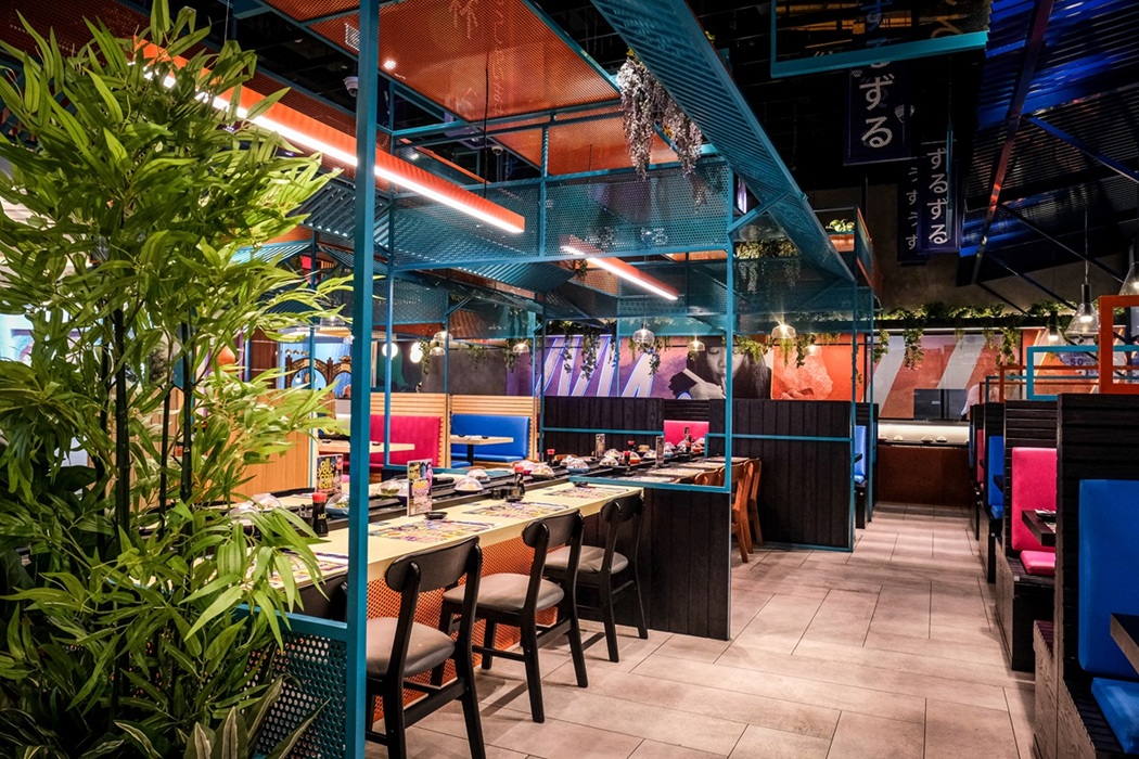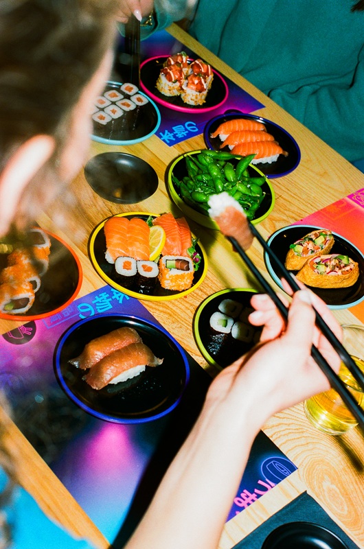 Experiencia gastronómica interactiva con cintas transportadoras icónicas.