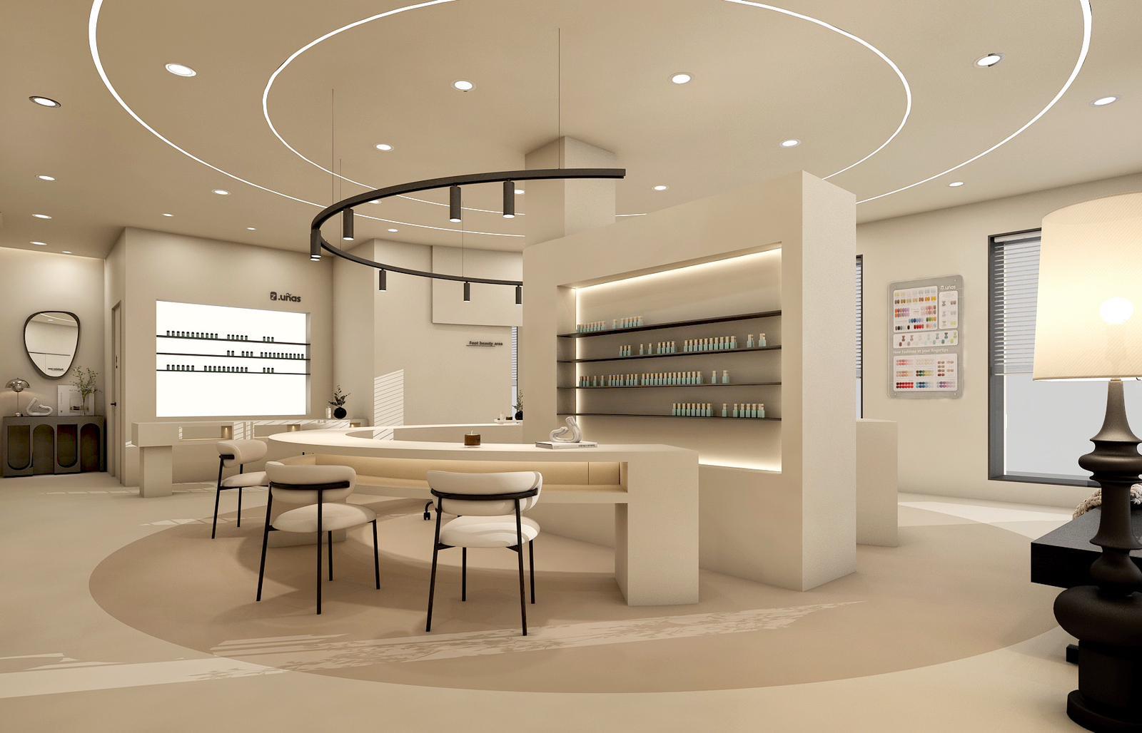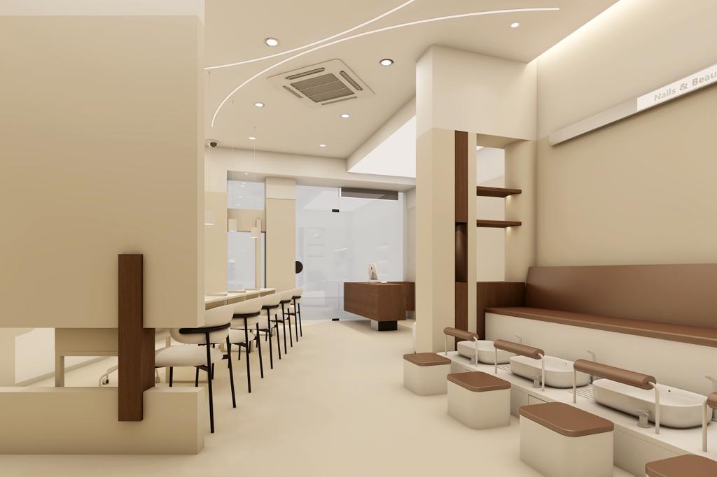 • Diseño del salón: Se proporciona un plano de distribución personalizado, optimizando los puestos de manicura y pedicura para asegurar un ambiente funcional y atractivo.
